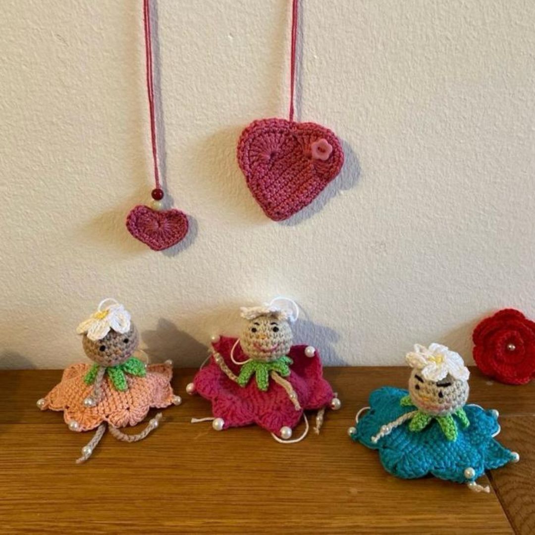 darunter Schals, Mützen, Stirn- und Haarbänder sowie kuschelige Babydecken mit abnehmbarem, gehäkeltem Teddy. Darüber hinaus gibt es weihnachtliche Karten mit gehäkelten Elementen sowie Woll-Schmuck.