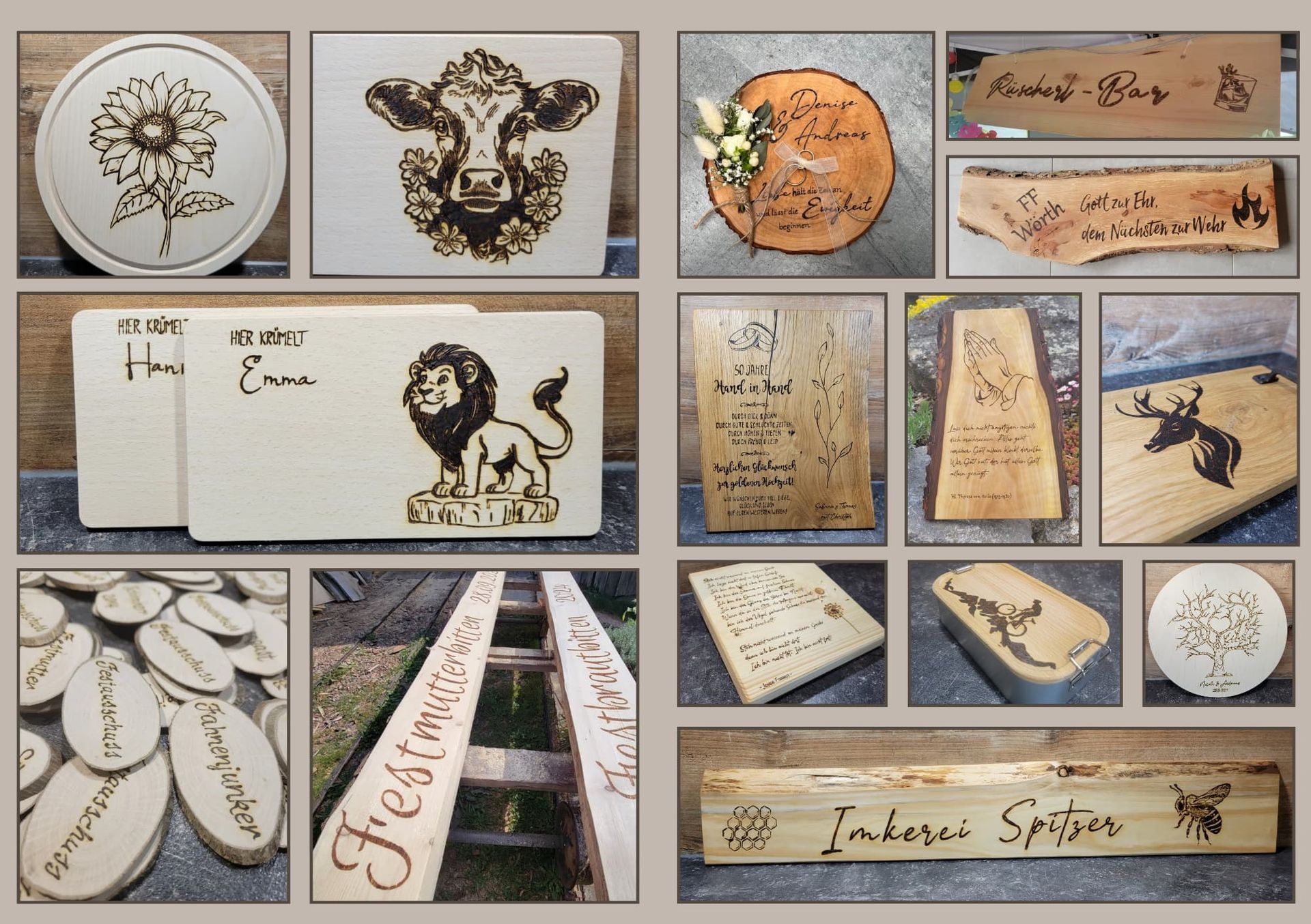 Was mit der Acrylmalerei begann, ist inzwischen zu einem vielseitigen kreativen Schaffen herangewachsen. Heute gestalte ich mit viel Liebe zum Detail personalisierte Ringbretter und Schilder mit dem Brandmalgerät – ideal als ganz besondere Hochzeitsgeschenke oder für andere unvergessliche Anlässe.