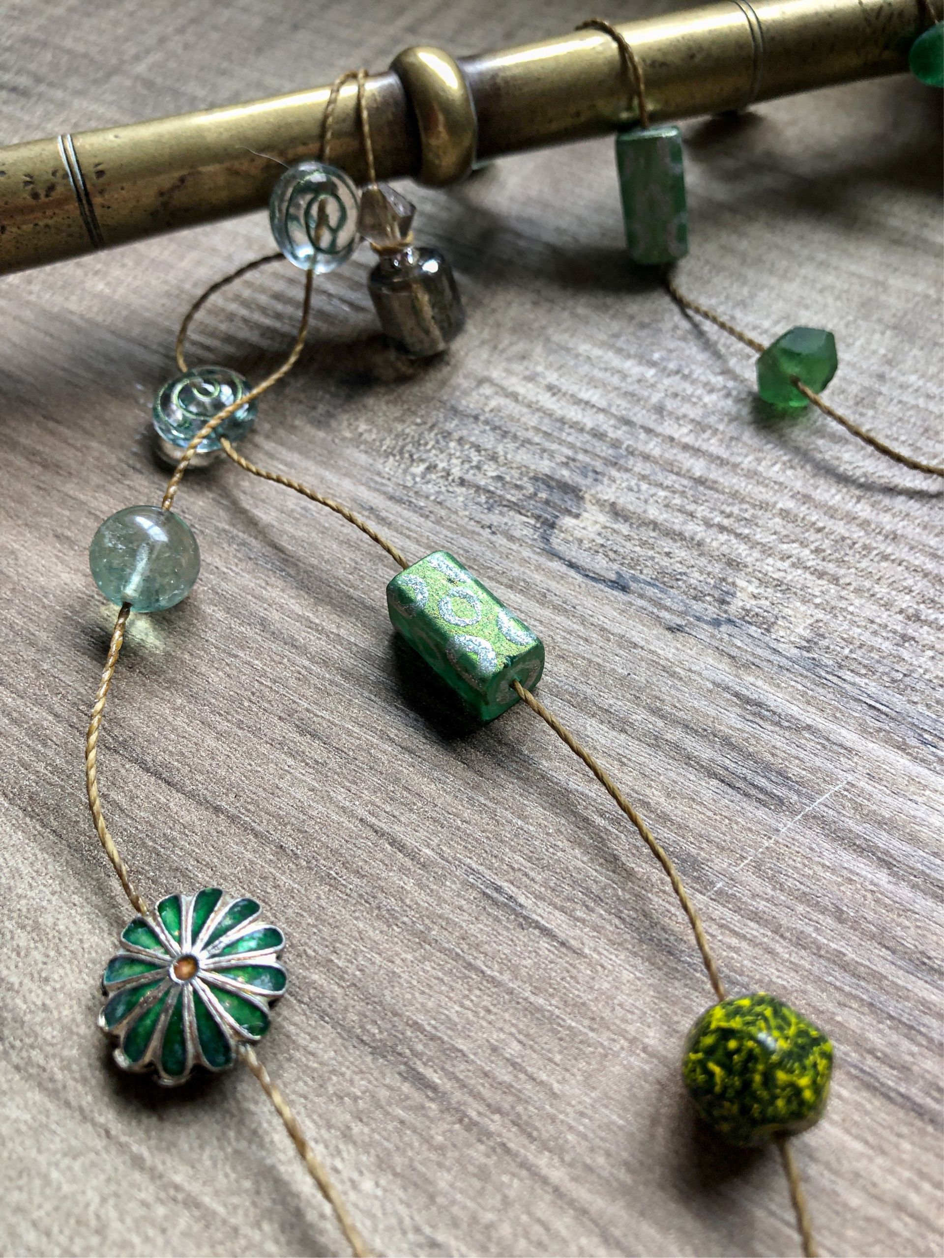 I use gemstones, glass stones, Swarovski crystals and silver/bronze ornaments in my unique pieces.